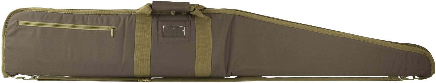 54" Shotgun Case, Brown Features:- The 2958 series shotgun case is 8" tall soft case that accommodate most hunting and sporting shotguns and bolt action rifles- Shotgun case features a large exterior zippered compartment, ID tag pocket, padded handle, and an adjustable shoulder strap with metal clasp and d-rings- High density foam inner padding for superior protection- Heavy duty zippers that have lockable metal loop zipper pull tabs for a small padlock (not included)- Measurements provided are the outside overall length & height of the gun case, we recommend a case that is 2"+ longer than your long gun for an easy fitment- Constructed of tough PVC material that is chemical and water resistant Specifications:- Length: 54"- Height: 8"- Color: Brown